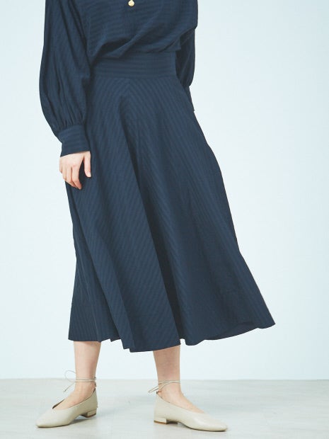 脇が長くなったシルエットとストライプの柄が脇にいくにつれてナナメになってくるので、スカート全体に動きと表情がでるようになっています。