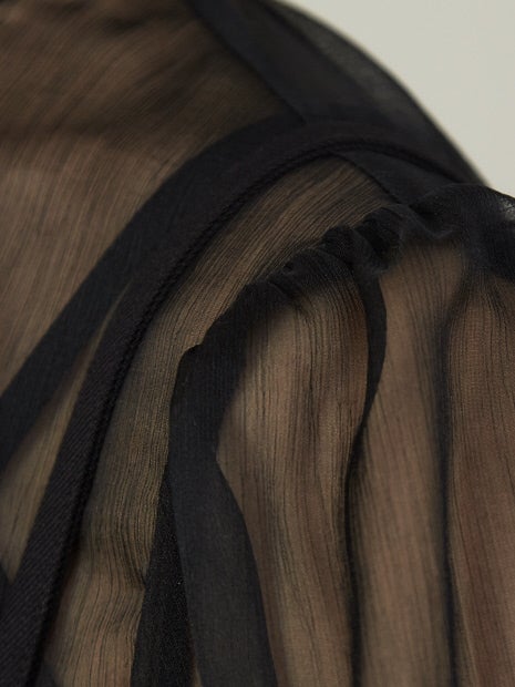 ネックのフリルやパフスリーブがポイントの、繊細な楊柳ブラウス。