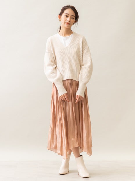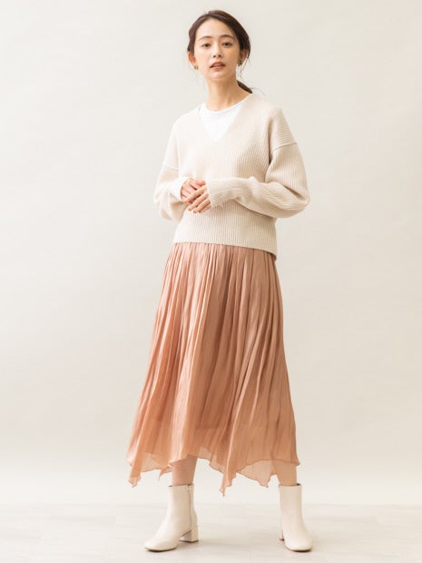 イレギュラーヘムになったことで、ON/OFF共に着回しやすくなったスカートは、ベーシックなトップスと合わせても裾に動きが出るので、コーディネートがシンプルになりすぎず◎