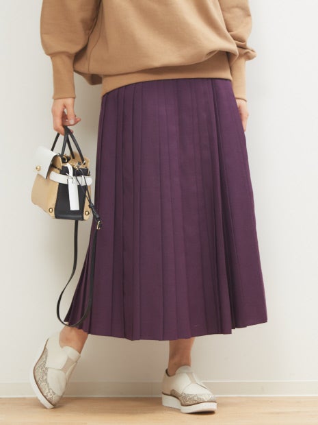 ラップスカート風のデザインで、プリーツの太さがランダム仕様などディティールにこだわった一枚。ウール混なので柔らかな雰囲気があり、上品な女性らしさを演出してくれます。ウエストの部分はDカンベルトが付いており、調節できるのも嬉しいポイント◎ トップスはざっくり編みやゆったりとしたシルエットのニットと合わせるなど、今年らしい大人カジュアルなスタイリングでおすすめ。