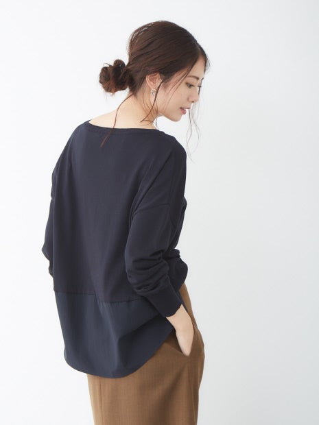 光沢感がある細番手のきれい見えニットと、細かなシボが入ったポリエステルタイプライターの素材を組み合わせたドッキングデザインがポイントのトップス。