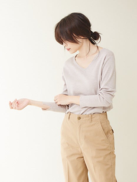 ボートネックとVネックの前後2WAYで着用可能。1着でコーディネートの幅が広がります。薄手のニットなので、ボトムスにインしてもウエスト周りに当たりが出ずにキレイに着ていただけます。