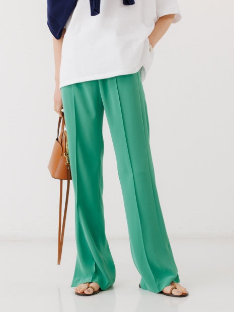 サイドに真っ直ぐ落ちる側章風のラインと、センタープレスステッチが脚をスッキリと長く見せ、裾に施したスリットは履くだけで抜け感を演出してくれます。
