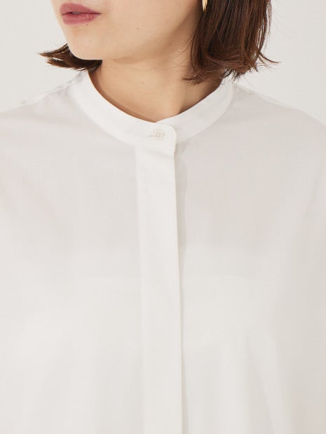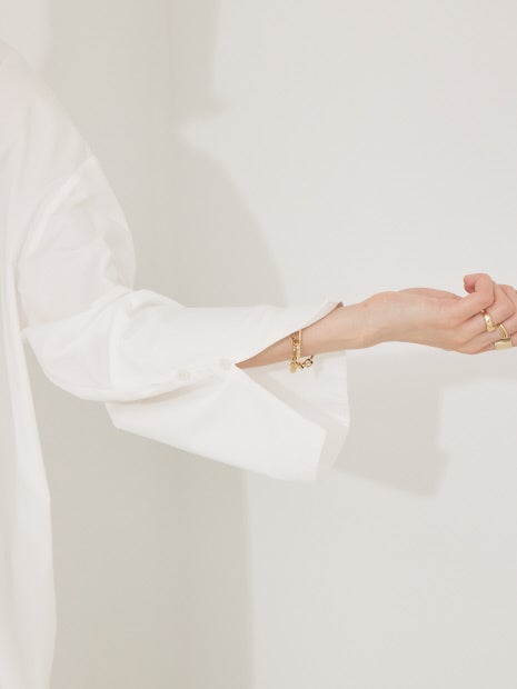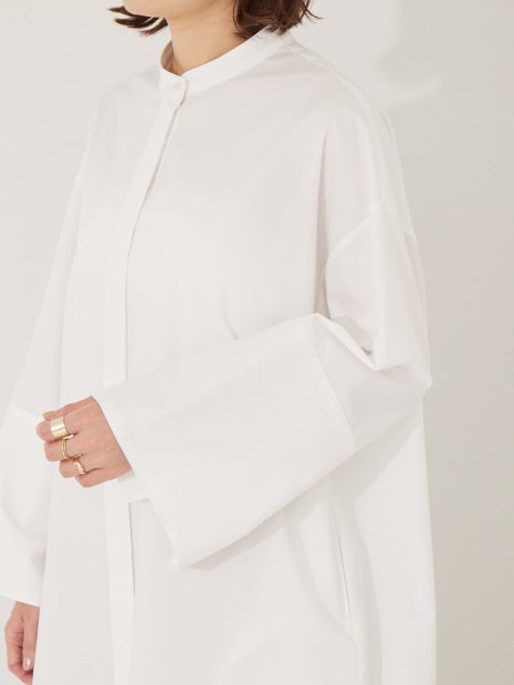 シンプルなスタンドカラーですっきりとした襟元に対して、大きい袖口が特徴的なメリハリの利いたデザイン。