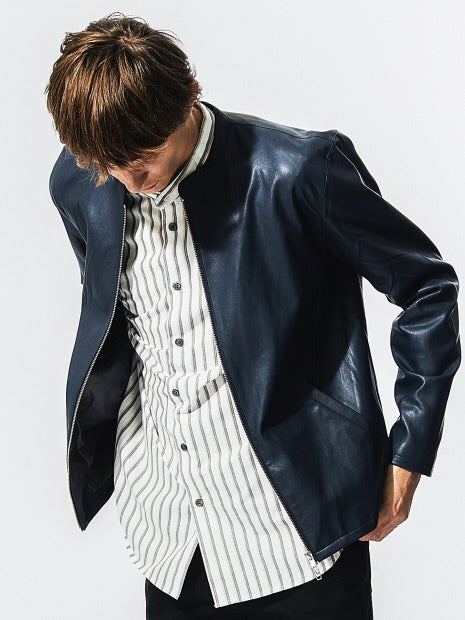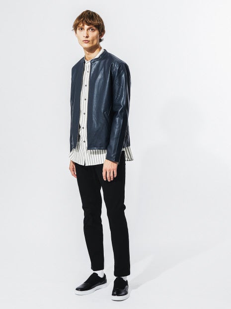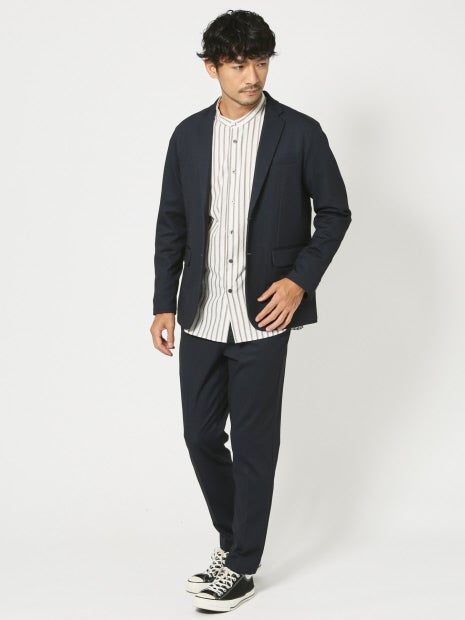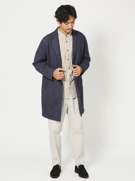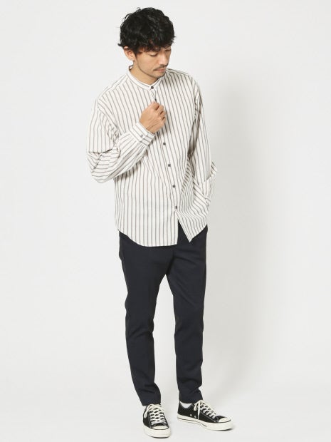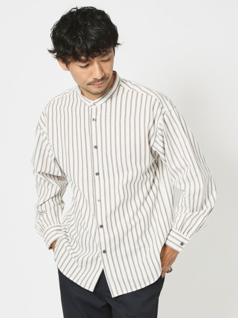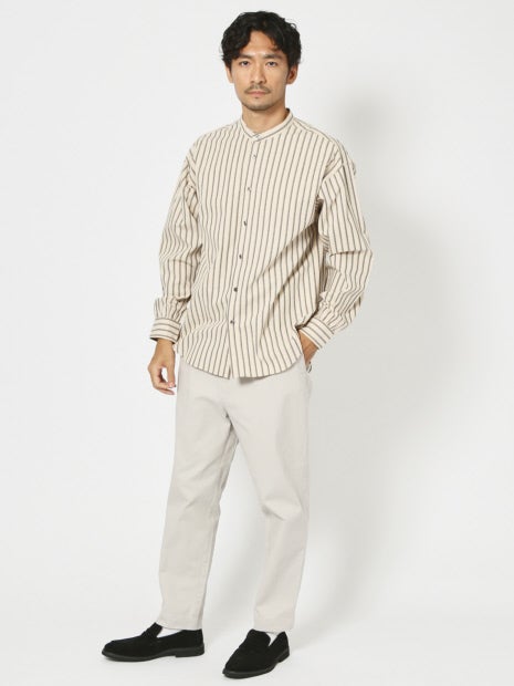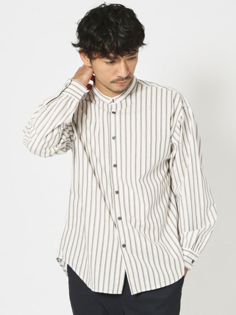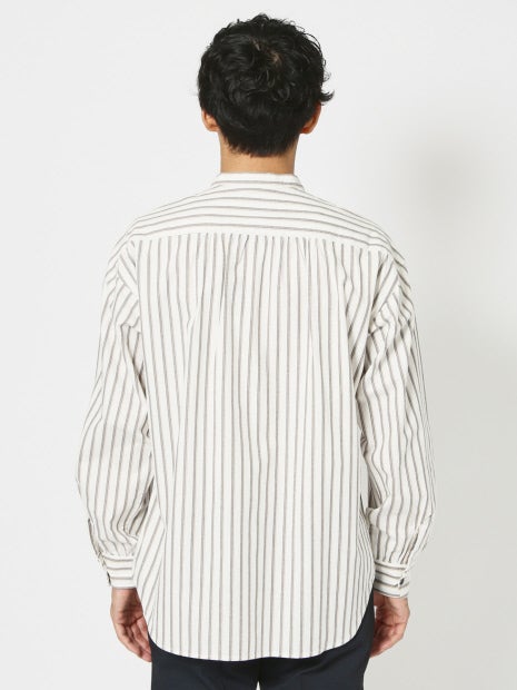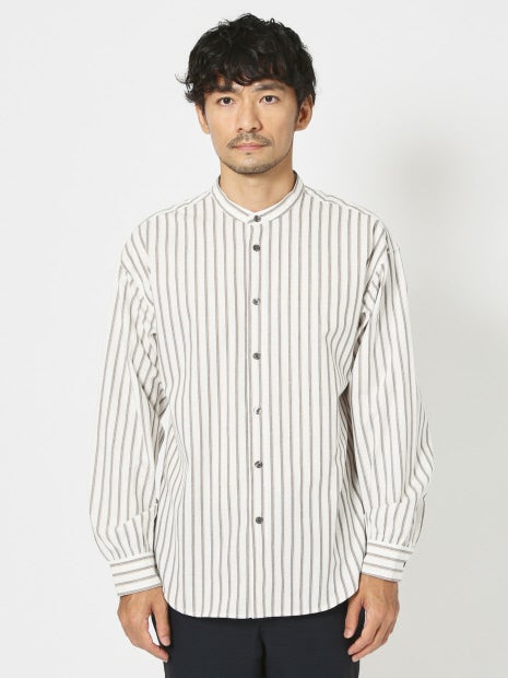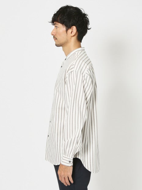 ストライプ柄のバンドカラーシャツ。ややオーバーサイズに作られているので、リラックススタイルにもおすすめです。