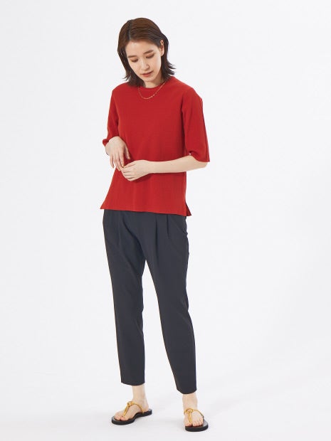 ウエスト部分のタックを短くし、ポイントを上げることでスタイルアップ効果と太もも部分のもたつきを軽減。