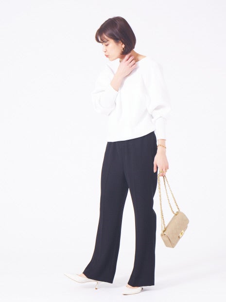 しっかりした生地感なので、トップスは透け感あるブラウスで抜け感をプラスしたスタイリングがおすすめです。