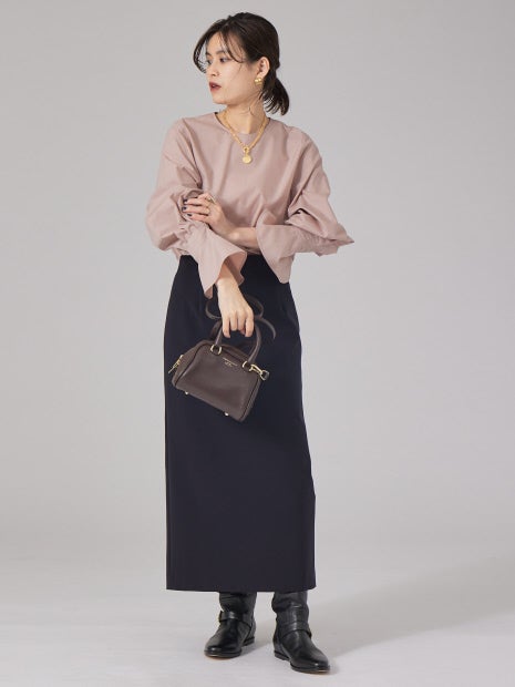 スモークピンクは、黒やネイビーと合わせると甘さを抑えたバランスのいいコーディネートに仕上がります。