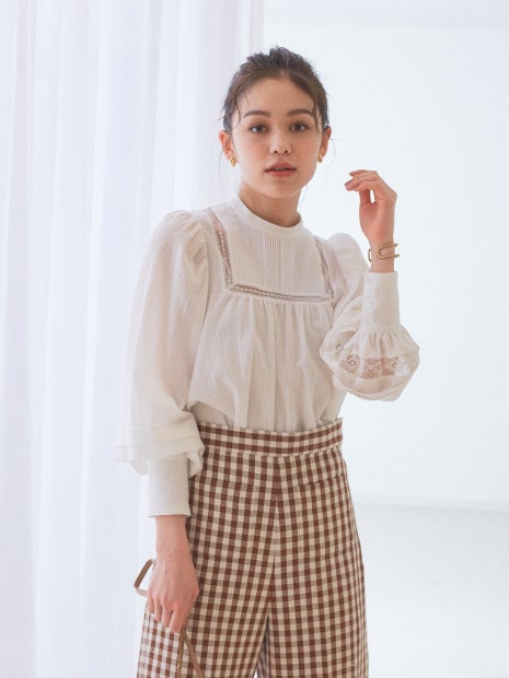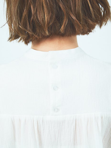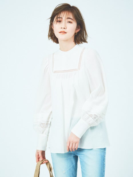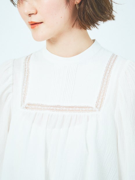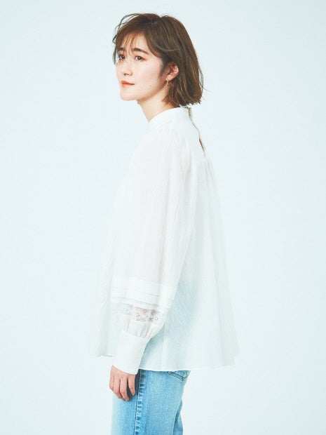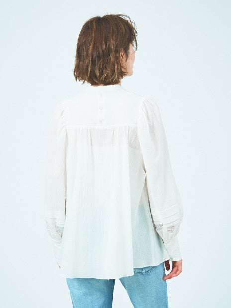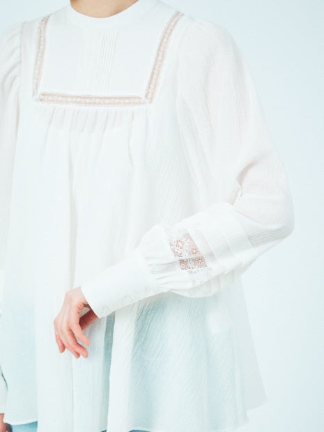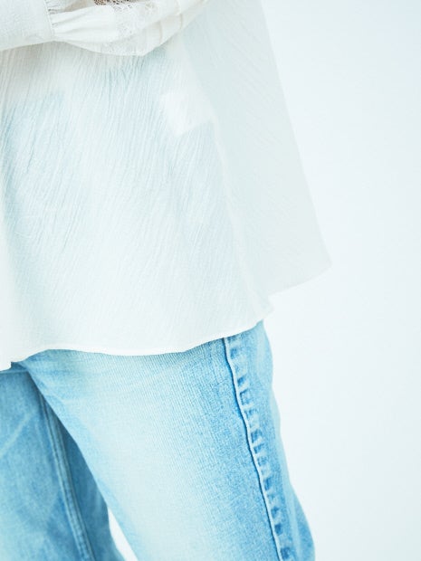 表面に凹凸のある楊柳調の素材を使用したレースブラウス。