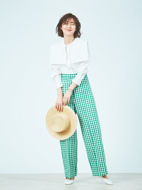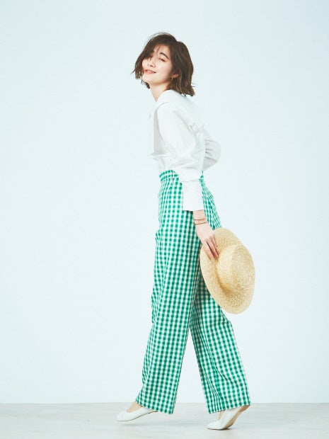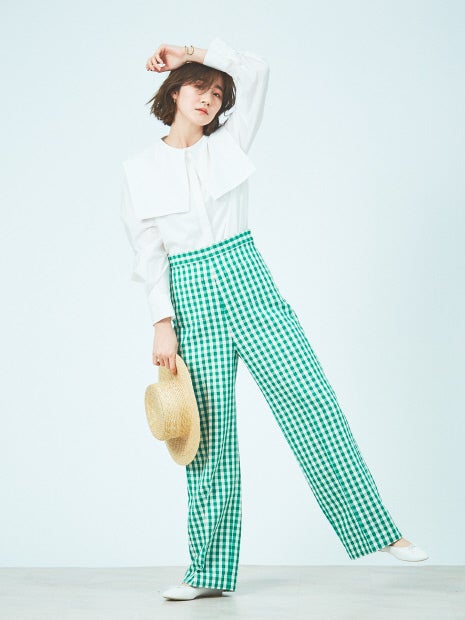 少しフレアーなシルエットのハイウエストパンツは今年らしいシルエット。
