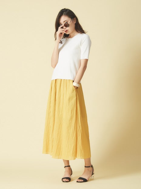同素材のブラウスと合わせてワンピース風に着こなすのもオススメ。夏のリゾートシーンを演出します。