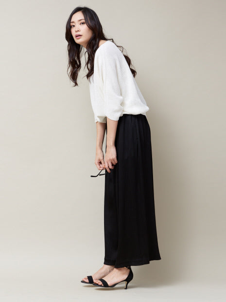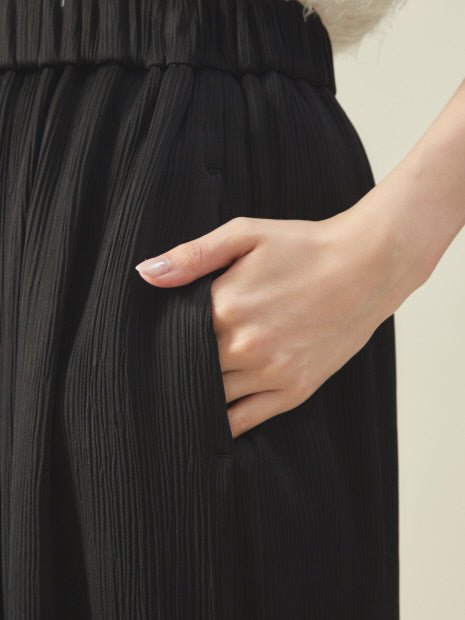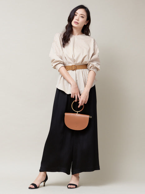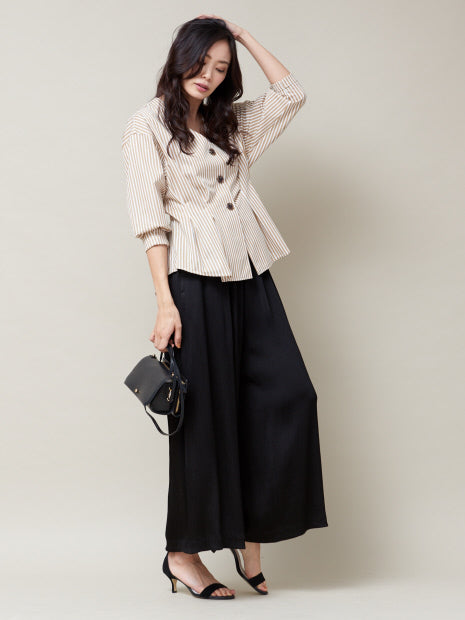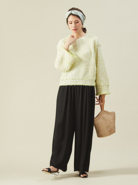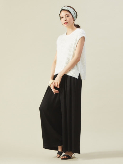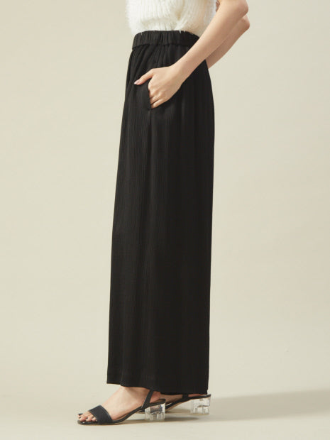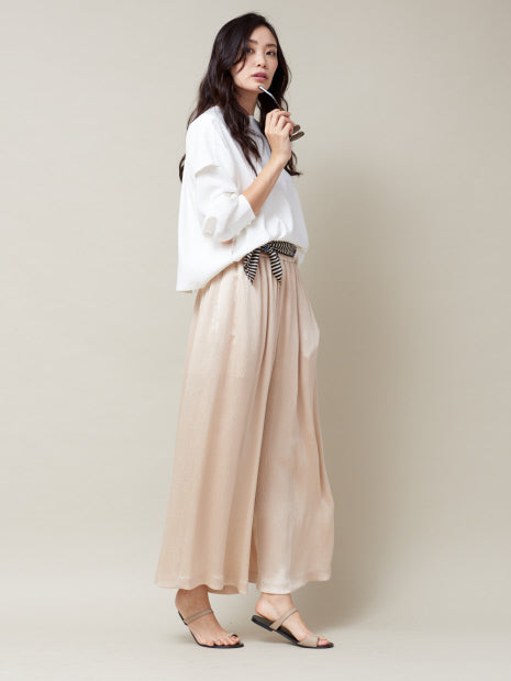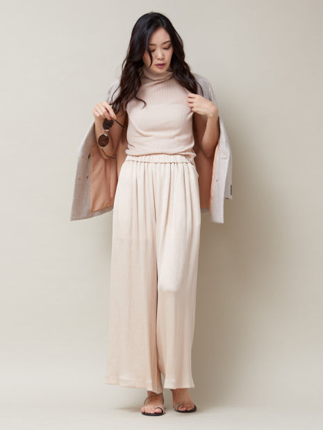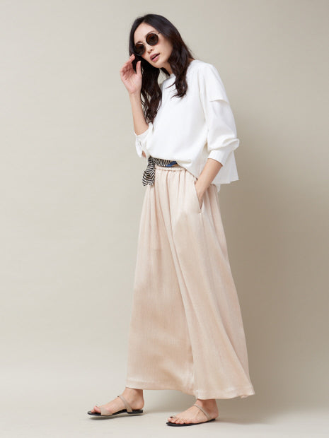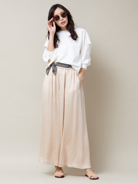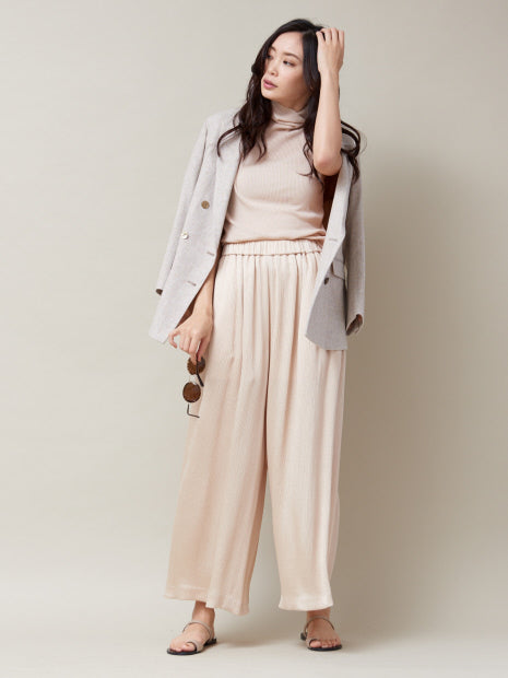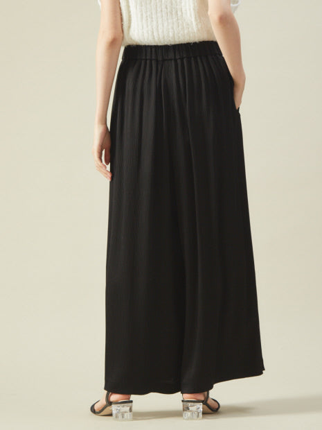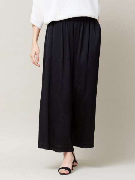 *Detail*歩くたびふんわりとなびく、春夏リゾートシーンにおすすめのワイドパンツ。楊柳のシボ感によリュクスな雰囲気で大人の余裕を感じて頂けるリラックスパンツです。上品な落ち感とフレアなシルエットが女性らしさを演出してくれます。ウエスト部分はゴム仕様なので、ストレスのない履き心地。*Coordinate*ヌーディ―なベージュはトレンド感があり、春夏のスタイリングにぴったり。ブラックはどんなトップスとも相性が良く、着回し力の高いカラーです。ブラウスで綺麗めにまとめたり、Tシャツなどでカジュアルに着こなすのもおすすめ。