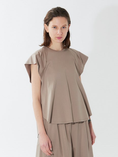 袖にタックをとり、ボリューム感を持たせ、シンプルながら着映えする一着。