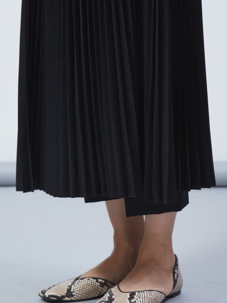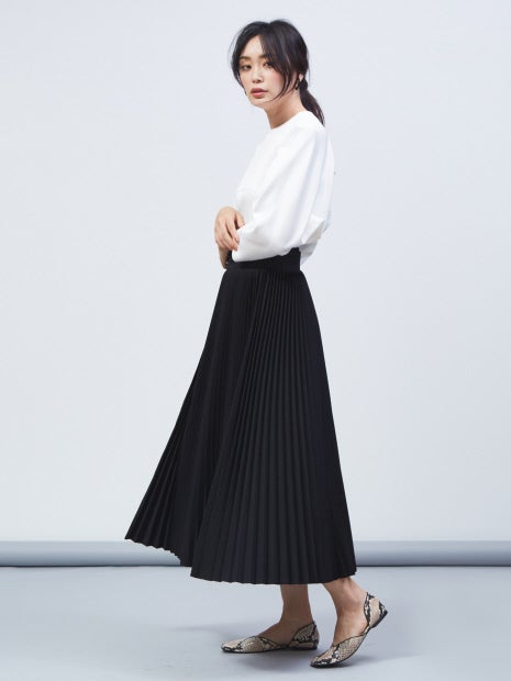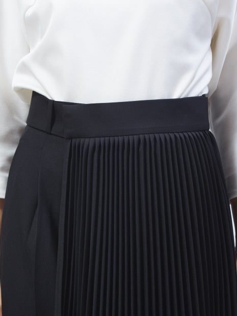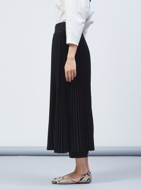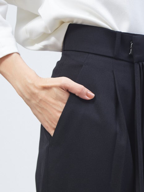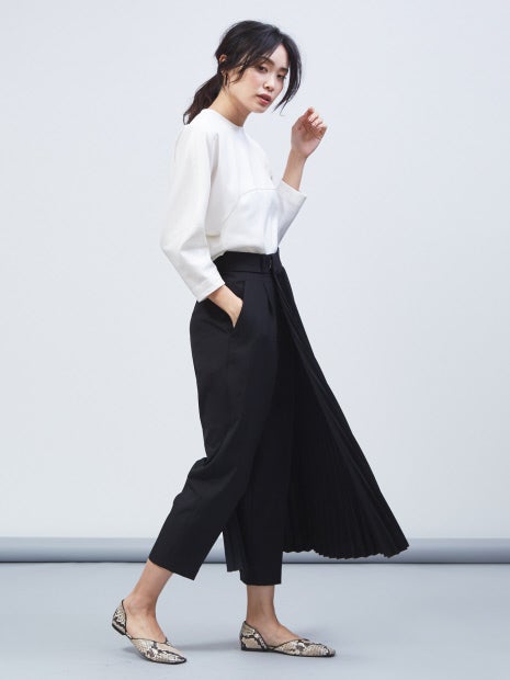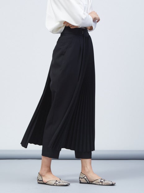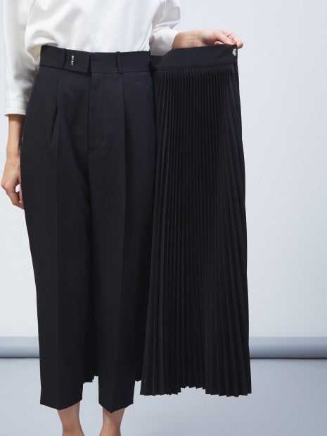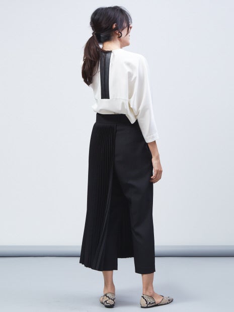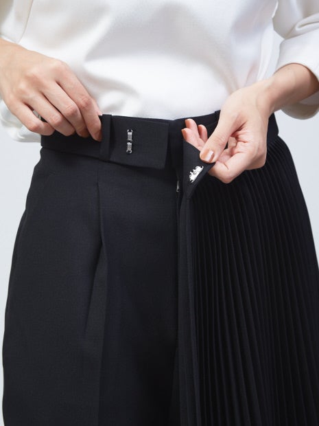 プリーツ部分はベルト仕様になっており、取り外し可能!また、手持ちのボトムにも組み合わせられるので、3パターンで着回しができます。“セット着用、テーパードパンツ、手持ちボトムとプリーツベルトを組み合わせ”で着方をお楽しみください。