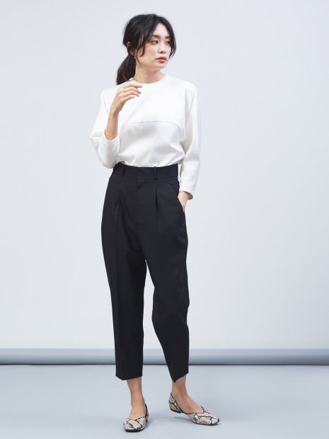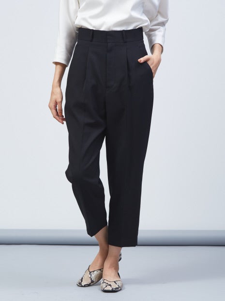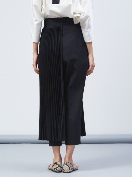 テーパードパンツにプリーツをドッキングしたモードなアイテム。