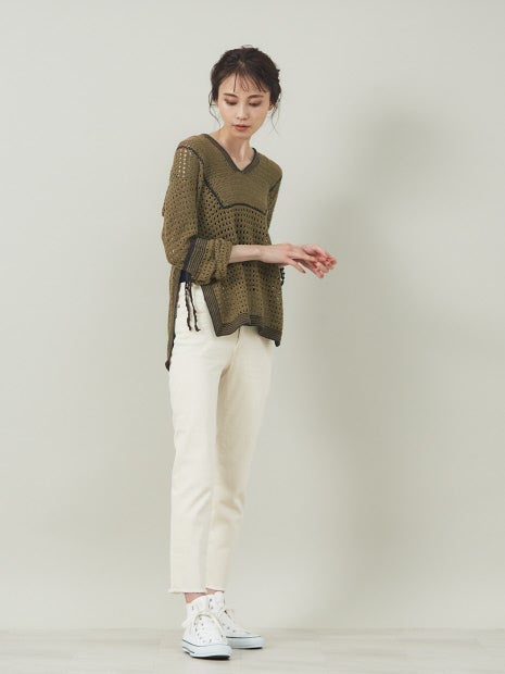 メッシュのようなテキスタイルのルーズなプルオーバーになります。袖口のテープを仕様して袖をラフにまくって着こなすのがおすすめです。
