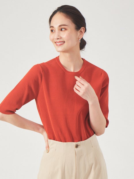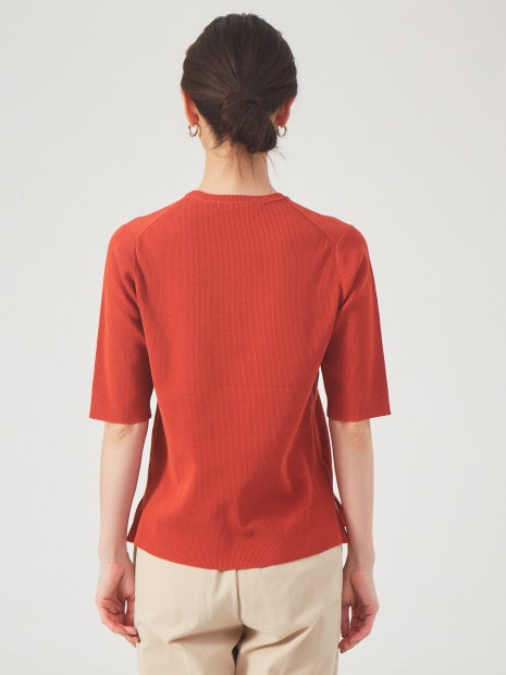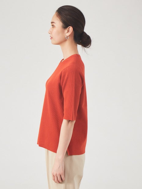 5部袖なので品があり、一枚でも羽織りのインナーにも使いやすいアイテム。