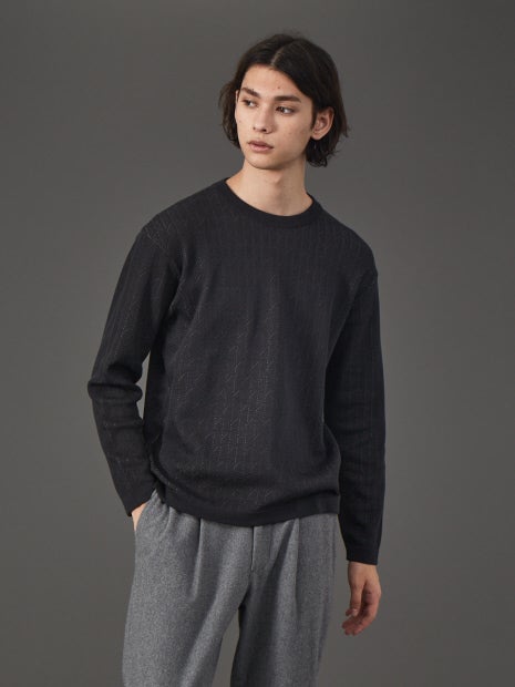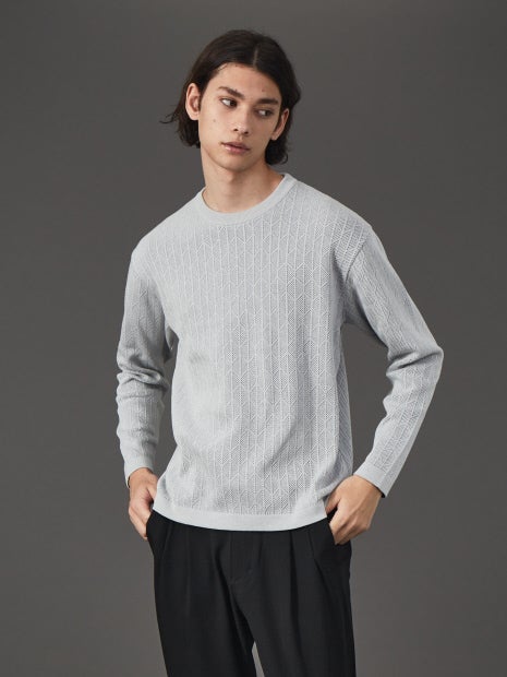 【デザイン】2色使いのニットにすることで陰影がつき、立体感のある柄感に仕上がっています。スマートなサイジングは、冬のインナーにも、春先の一枚着としても綺麗にお使いいただけます。万能なクルーネックなので、スタイリングを選ばずご着用いただけます。また、スモーキーなカラーが優しい印象に。【素材】コットン×アクリル素材の2色編み。ちくちくすることもなく、素材上通年ご使用いただけますので、1年通して長くお使いいただけます。