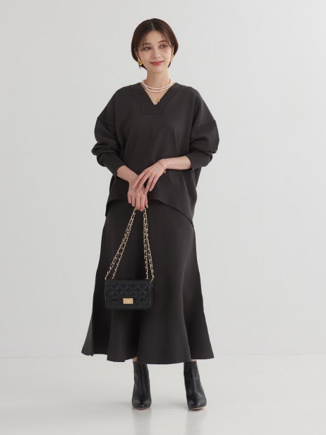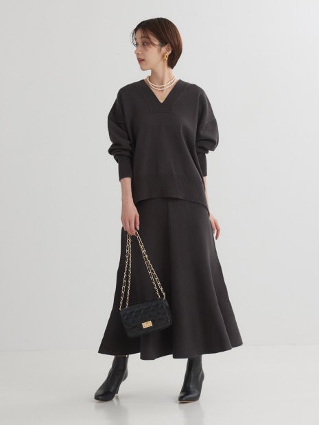 ふんわりとしたスカートを合わせれば、Vネックの抜け感にさらに女っぽさをプラスしたキレイめリラックススタイルにも。