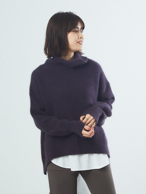柔らかくてふんわりとした毛足が女性らしい印象のタートルネックニット。