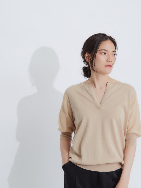 ・程よい開き感のヘンリーネックで首回りをすっきり見せ、抜け感をプラス。