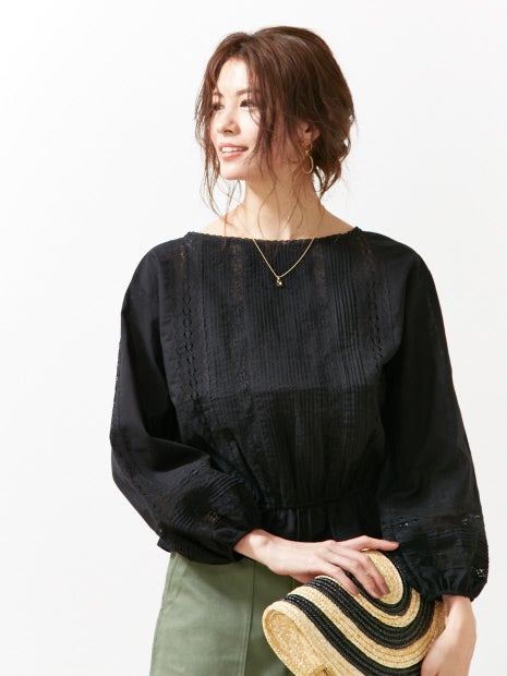 繊細なピンタックとレースを組み合わせた、Rouge vifらしい大人の甘さが際立つブラウス。すっきりとしたボートネックは、鎖骨ラインぎりぎりまで下げることですっきりとした顔周りに。ボートネック部分には細かいレースをつけて、シンプルになり過ぎないようにしました。ボリュームスリーブにも、袖の中心にレースをあしらい存在感がたっぷり。前だけでなく、横から見ても華やかなスタイリングを作ってくれます。ウエスト部分でぴったり止まるようにゴムを入れています。裾は広がり過ぎないようにして、ブラウジングをせず着てもちょうど良いバランスに仕上げました。デニムやベイカーパンツなど、カジュアルなボトムとコーディネートしてミックススタイルをお楽しみください。