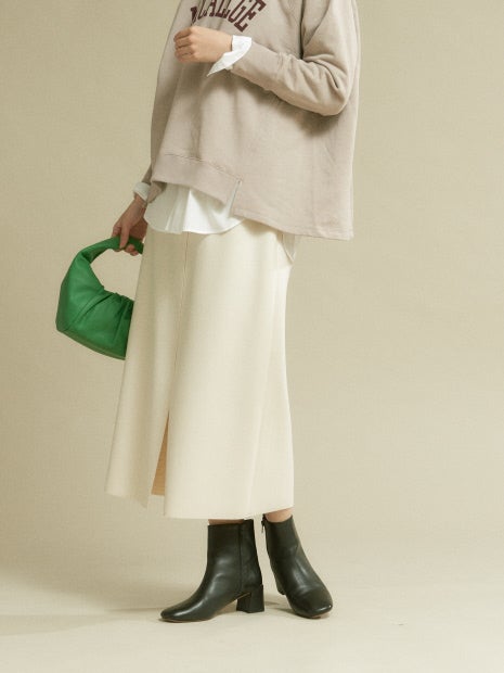 冬に映えるキレイ色のスカートなので、同色系や淡いカラーでまとめたコーディネートがおすすめ。