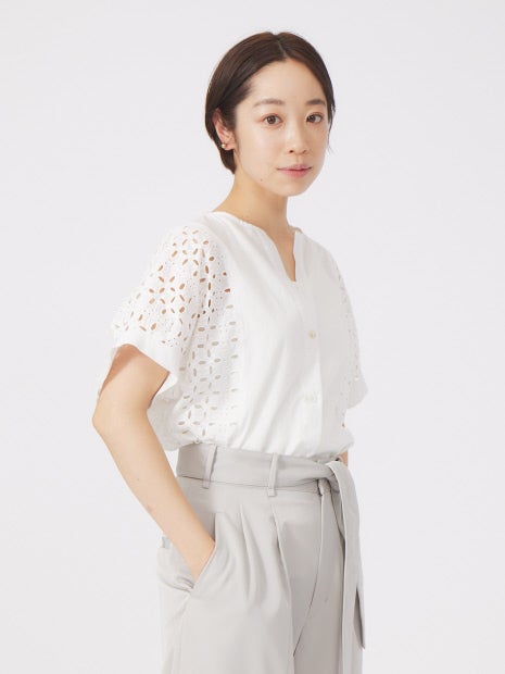襟元はVネックで抜け感を演出し、ヘルシーな肌見せを叶えます。