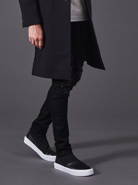 【テキスタイル】伸縮性と耐久性に優れた定番ハイブリッドデニムに立体加工&USED加工を加え、クラッシュ部分の当て布には本革のストレッチゴートレザーを使用。【デザイン】スーパーストレッチスキニーデニムにブランドの得意とするリメイク加工を施し、当て布にはストレッチゴートレザーを贅沢に使用。穿くだけでラグジュアリーな雰囲気を堪能できる高級スキニーデニムに仕上げました。※インディゴは程良いヴィンテージ仕上げ。ブラックはワンウォッシュでフルブラック仕上げ。