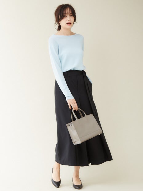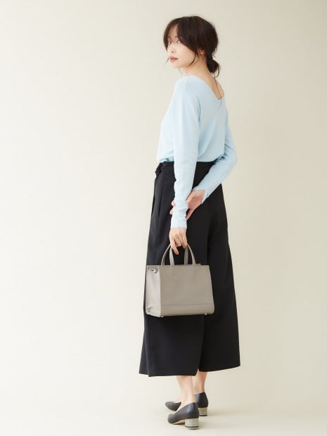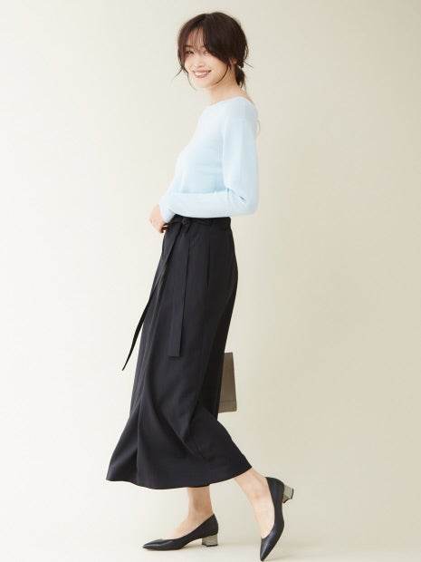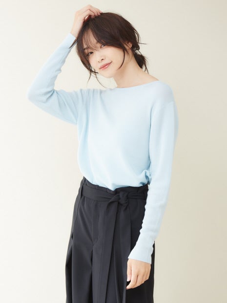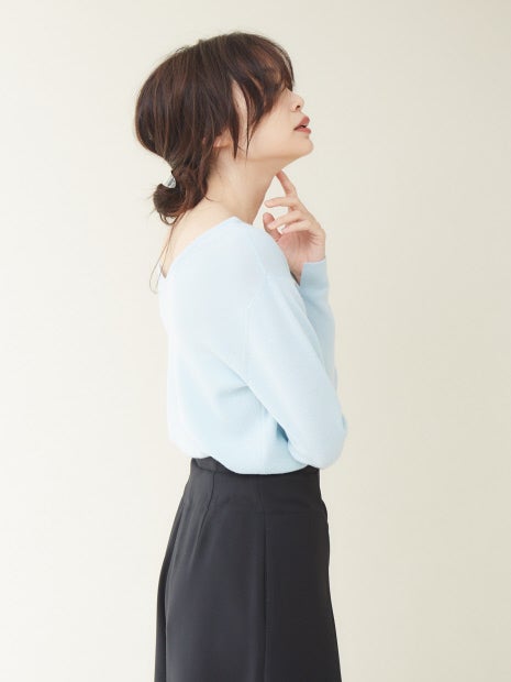 ボートネックとVネックの前後2WAYで着用可能。1着でコーディネートの幅が広がります。薄手のニットなので、ボトムスにインしてもウエスト周りに当たりが出ずにキレイに着ていただけます。