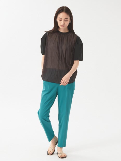 デザイン性のあるトップスはシンプルなパンツと合わせるだけで様見えを叶えます。