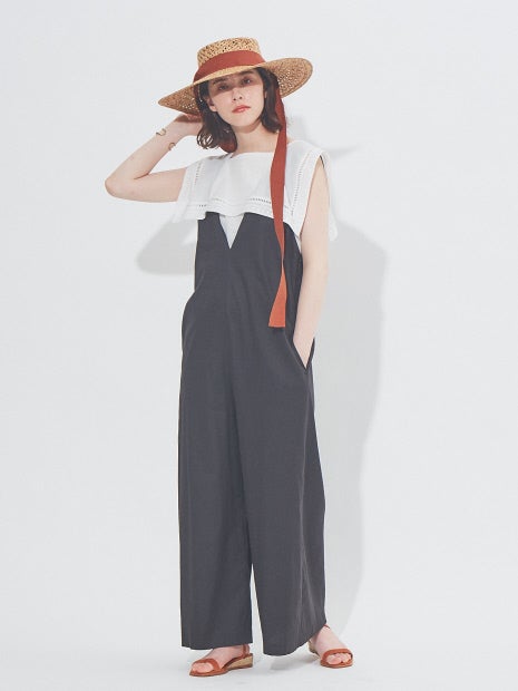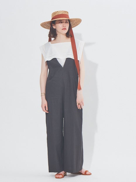 リネン混のレーヨン素材とシックなカラーで、夏のリラックススタイルに最適なオールインワン。
