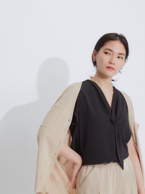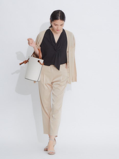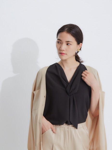 ・トレンドのボウタイをVネックに取り入れ、縦長効果でスタイルアップも期待◎