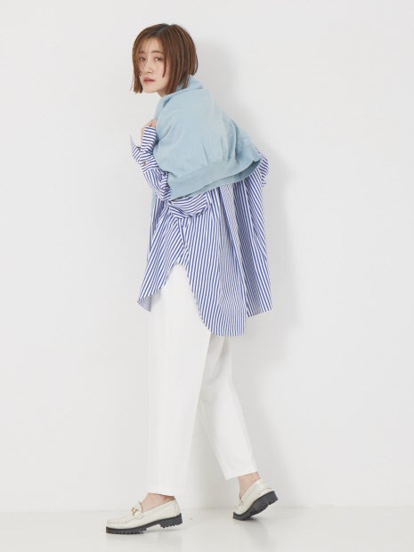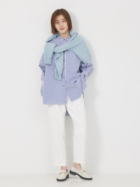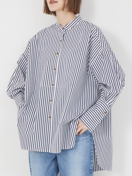 ハリがあり着心地の良いコットン素材を使用したストライプシャツ。サイドのカッティングがさりげないポイントに◎程良くオーバーサイズなシルエットなので、一枚着としても羽織としても着られる優秀アイテムです。袖はカフスを長めにとり、ニットやスウェットとのレイヤードにも使いやすいデザインに仕上げました。