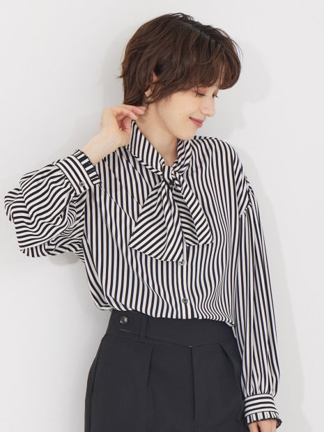 リボンタイとストライプ柄で、今年らしいクラシカルさのあるブラウス。