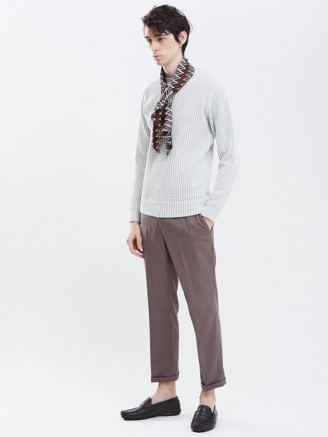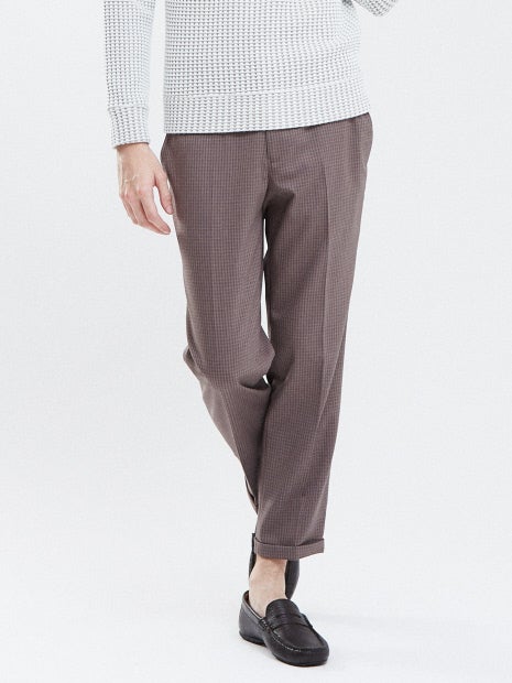 【素材】ウールとポリエステル素材を使用。サラッとした肌触りとストレッチのある生地で快適な履き心地です。【デザイン】細身シルエットにクロップド丈で脚をきれいに魅せるザインに仕上がっています。レトロ感ある配色のスモールチェック柄。シックなスモールチェックがワンランク上の大人カジュアルを演出します。【コーディネート】シャツやニットと合わせたキレイめカジュアルは勿論、ロングTシャツにライトブルゾンを羽織った春コーデがオススメ。