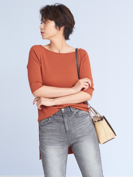 すっきりとしたシルエットで前後の丈感がアクセントのニット。