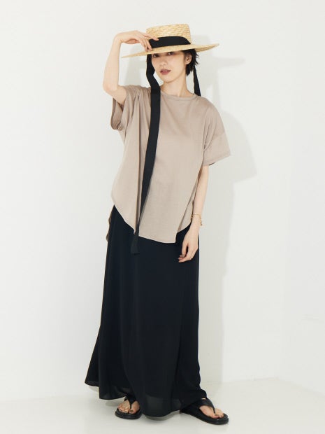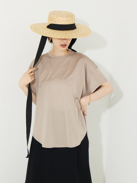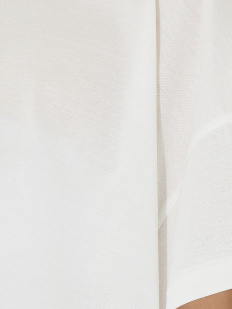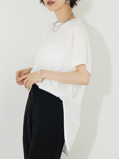 細番手のシルケット天竺カットソーを使用したデザインTシャツ。シルケット加工を施し、毛羽を抑えた綺麗な目面でフブラウス見えするイージーアイテムです。