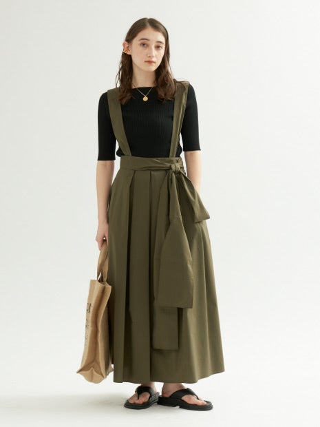 タックを深めに入れたボリュームのあるフレアスカートに、ワイド幅のショルダーストラップを付けた、少しレトロな雰囲気が今年らしい1着。