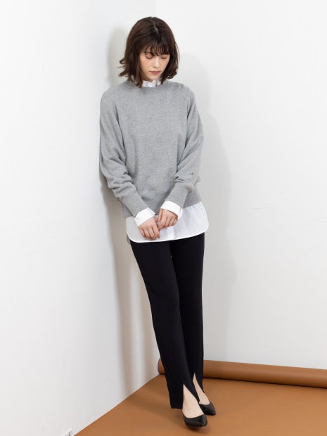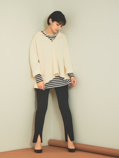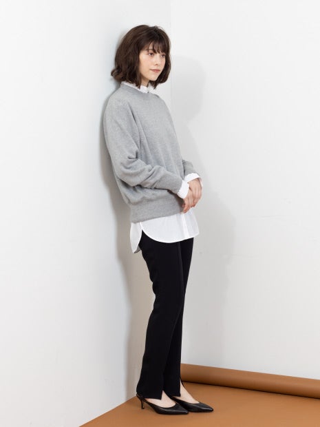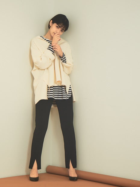 細見でスリムなシルエットなのでオーバーサイズシャツやスウェット、ざっくりニットなど着丈のあるトップスとの合せがおすすめです。