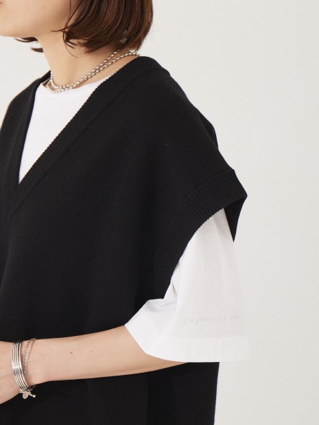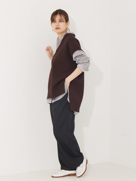 秋のレイヤードスタイルが簡単に楽しめるニットベストは季節の変わり目におすすめです。