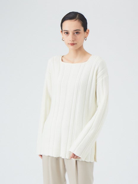 ランダムストライプの編地とスクエアネックのデザインがこなれ感をプラス。
