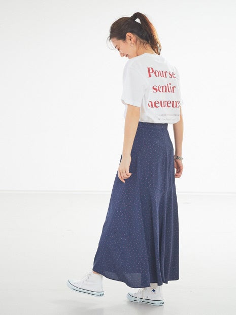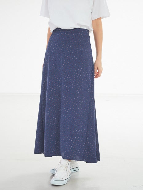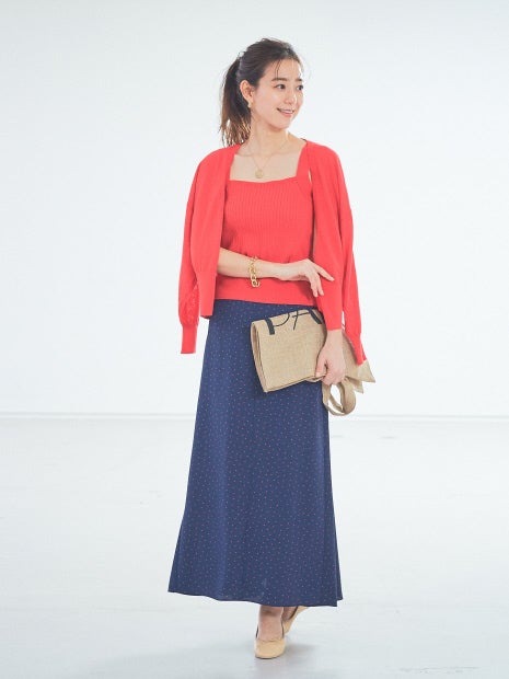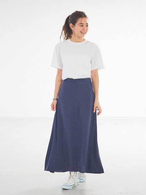 小さめドットが甘くなりすぎず大人な印象で着られるスカート。