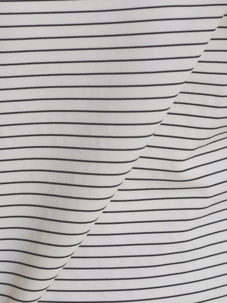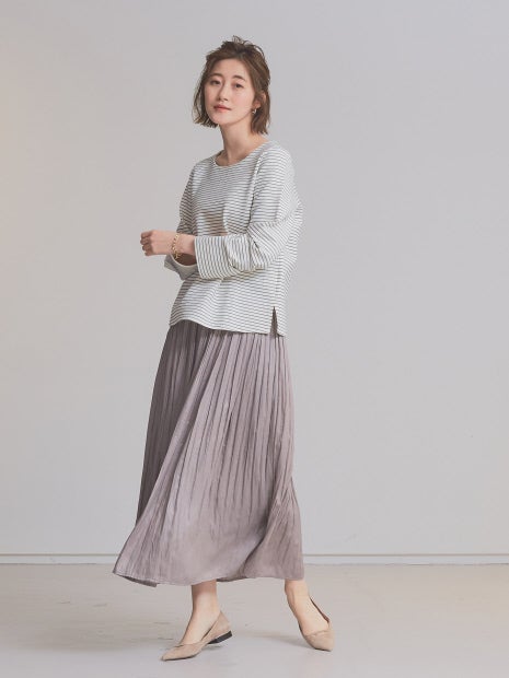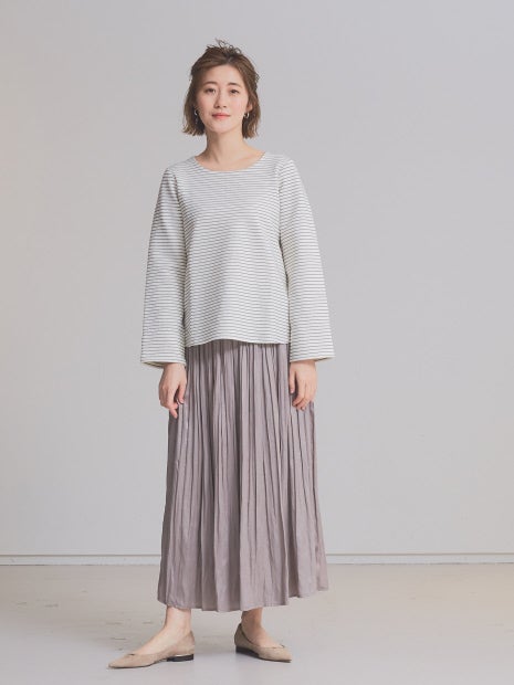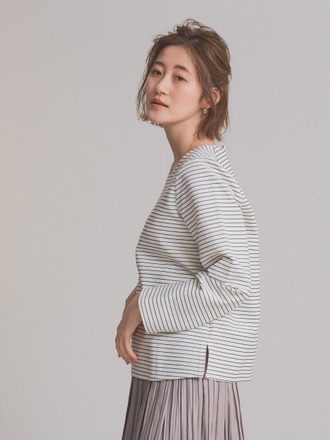 カジュアルすぎない細ボーダーが程よく綺麗めな印象で、とろみ系のパンツなどと合わせれば通勤にも使えそう。