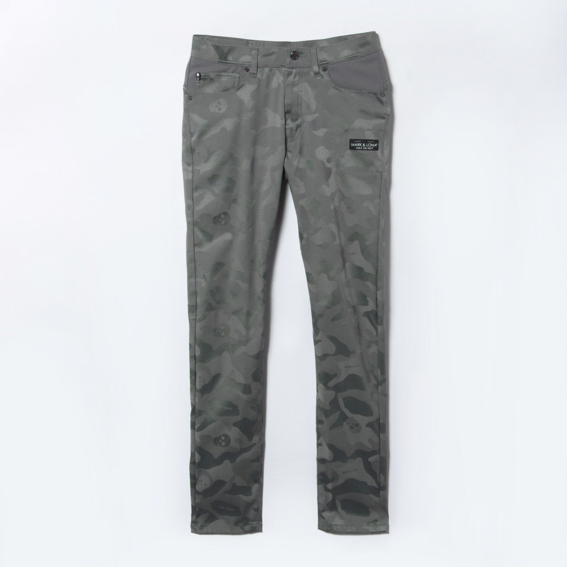 オールシーズン着用可能なスリムフィット5ポケットパンツ。フロントにロゴ入りタックボタン、左腿にロゴ入りティーホルダー、後ろ帯にサークルスカルデザインのロゴパッチを配しました。ミドルライズで、ストレッチの効いた素材特性を活かしたスマートなシルエットに仕上げています。