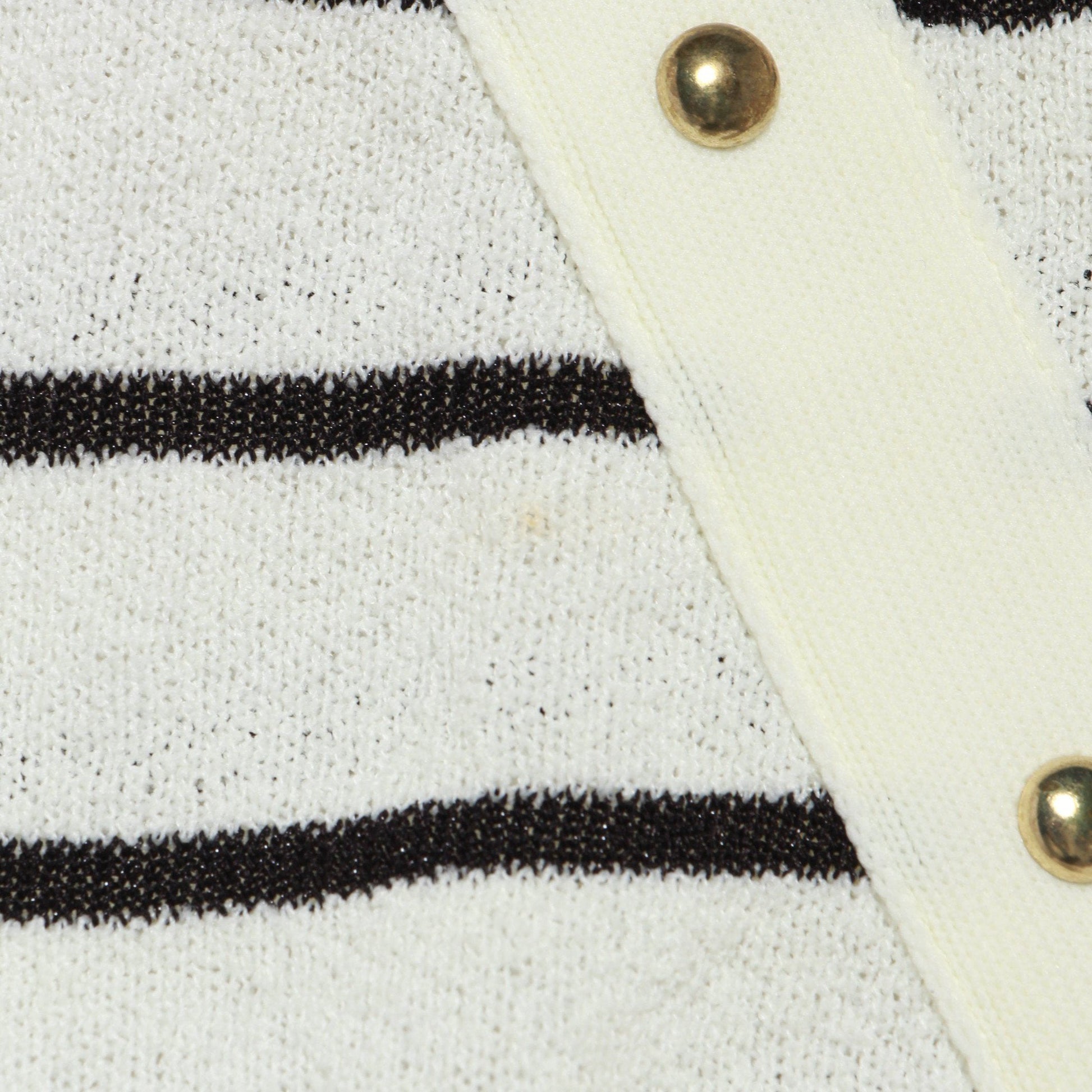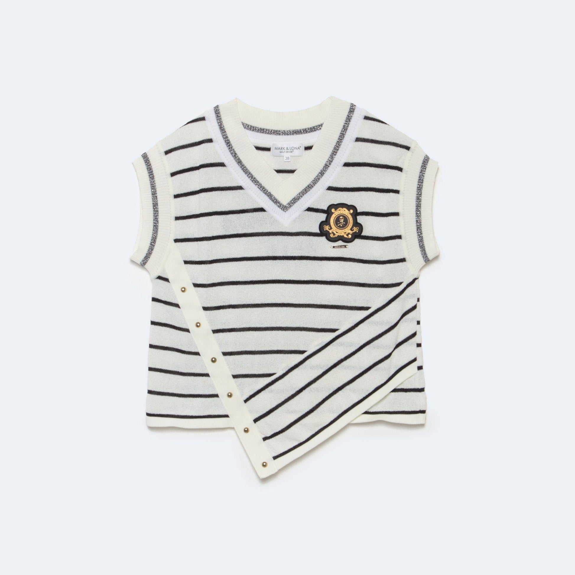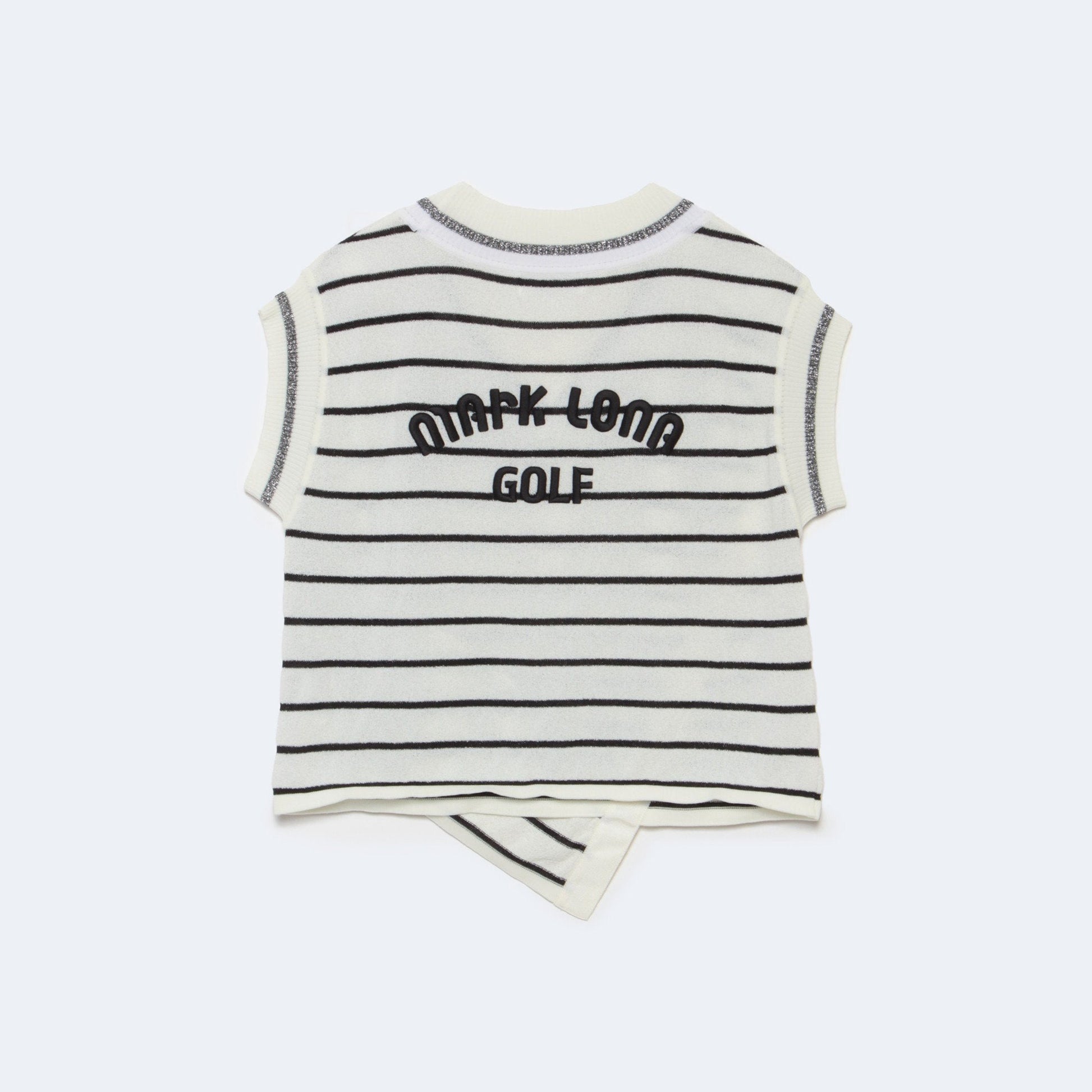 2023 SPRING | SUMMER COLLECTION・初夏のゴルフシーンでも活躍する軽量、ドライタッチが特徴の、オーセンティックなボーダーVネックニットベスト。・左胸に緻密な表現のクレスト刺繍風プリストワッペンロゴメタルプレート、背中に立体的な丸みのあるロゴデザインの刺繍を配置。・ストレートな身頃、クロップド丈、ドロップショルダー、アシンメトリーヘム、でトレンド感のあるシルエットに仕上げました。プレイ用の重ね着を想定したパターンを採用し、楽なスイングが可能。タウンユース用には敢えて1枚で着用し、ややオーバーサイズなシルエットを楽しんで。・特殊紡績により軽さを持たせた、パイル状のファンシーヤーンと光沢感とキラリと光るラメが上品なポリエステル加工糸を用いて作られたオリジナル素材、春を感じる軽い着用感が特徴。・右脇から袖にかけて施された切替えラインとアシンメトリーヘムが特徴のカジュアルな外しアイテムです。・[Made in Japan]アイテム。