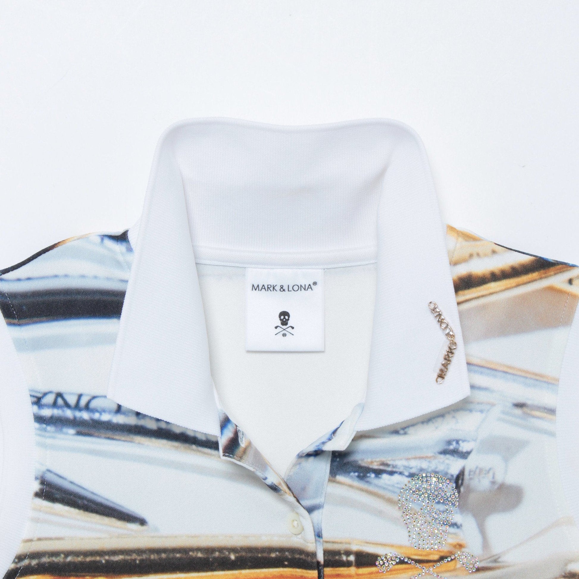 左胸にクリスタルストーンをアイアンスカルのデザインに配置し、その下にロゴ刻印入りのメタリックプレート、襟先にメタリックロゴチャーム、脇にスイングスカルのメタリック刺繍を配しました。本体生地は、高いストレッチ性とキックバック力に加え、ポリエステルのもつ吸放湿性や通気性なども備えているのが特徴。レギュラーフィットで、身幅に少しゆとりをもたせつつ、上品なシルエットと楽なスイングが可能なパターンを採用しています。