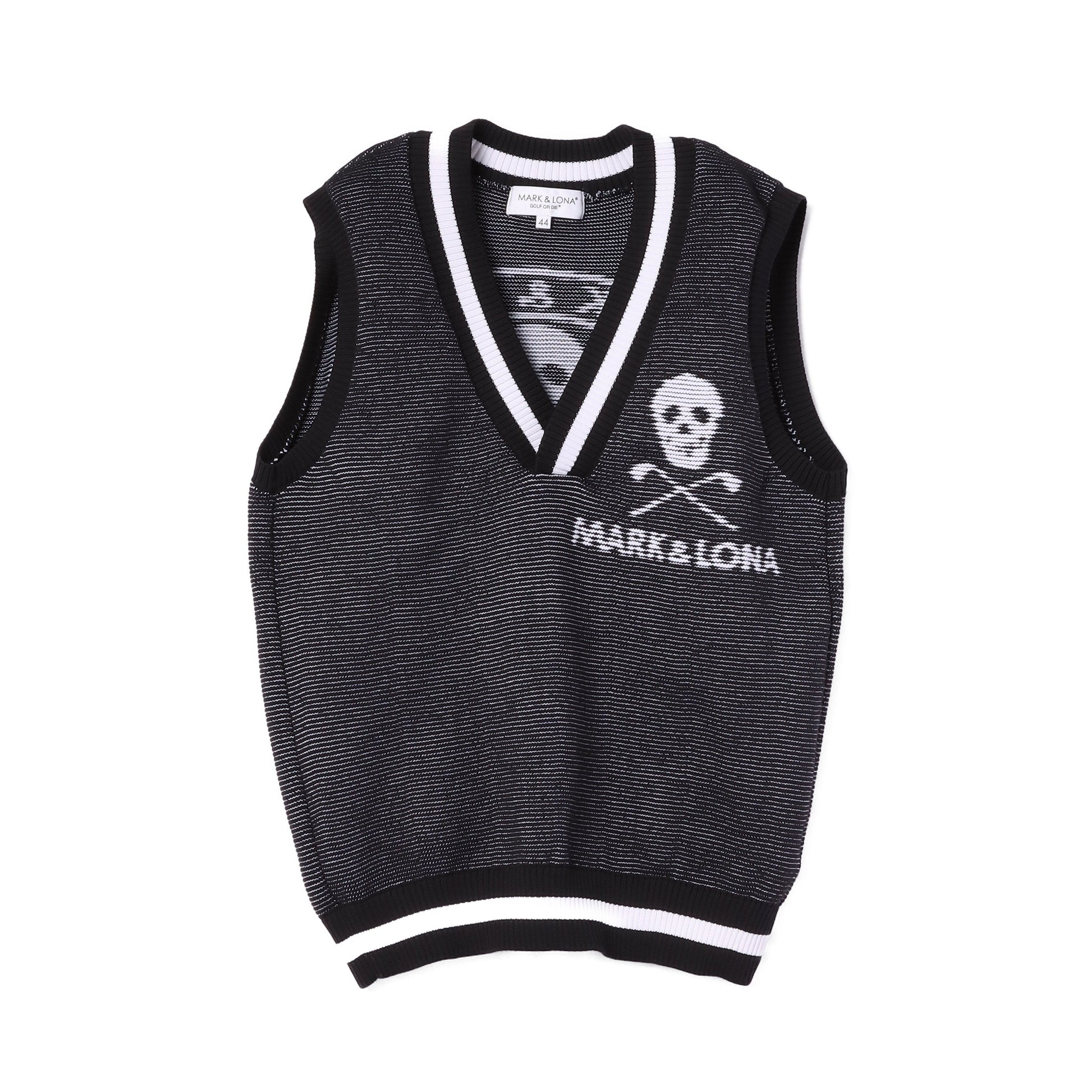 ブランドロゴやスカルが大胆にデザインされた深Vネックニットベスト。フロントにアイアンスカル、背中にブランドを象徴するサークルスカルをドロップジャカードで表現しました。身幅に少しゆとりをもたせつつ、上品なシルエットと楽なスイングが可能なパターンを採用しています。