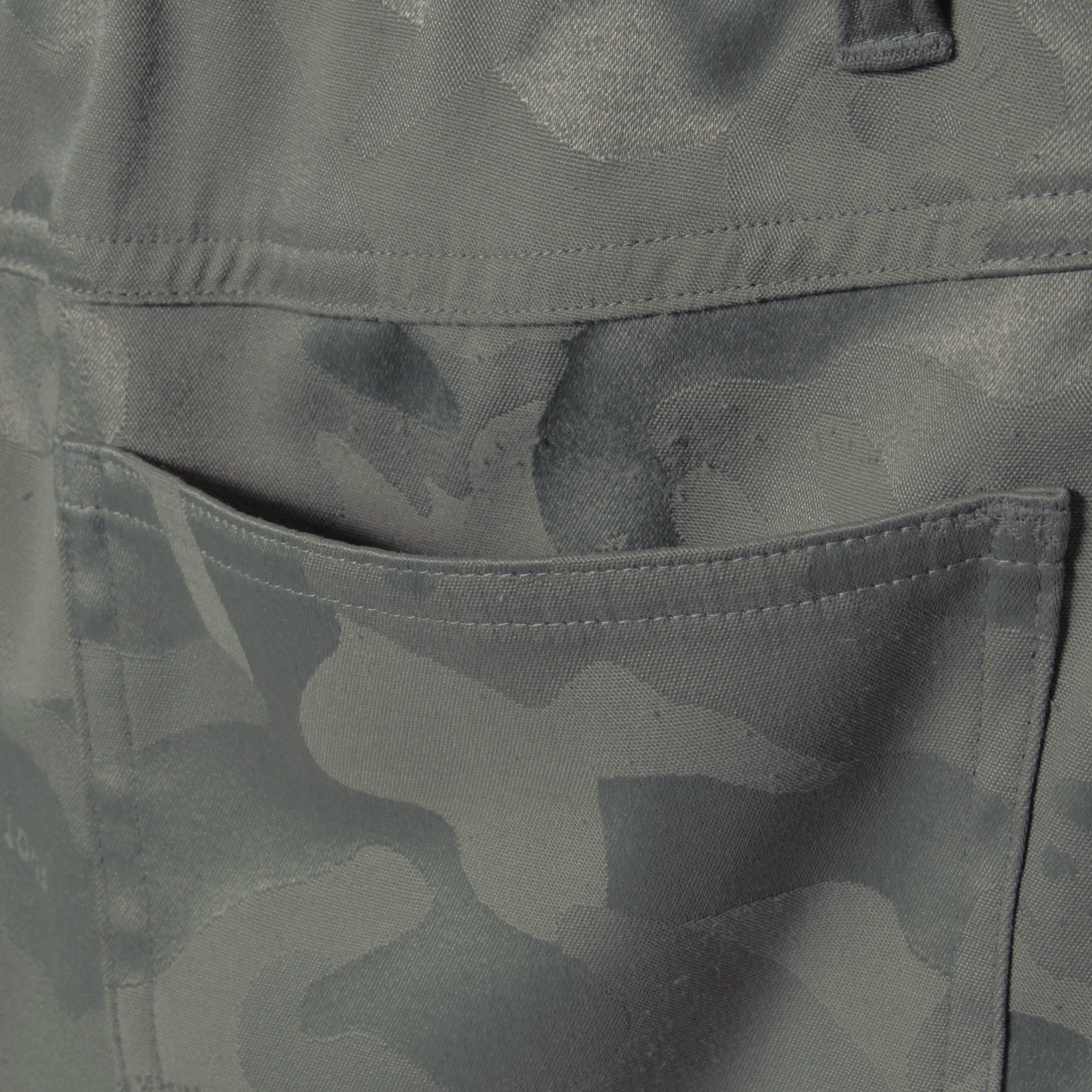 シンボリックなオリジナルカモフラージュ柄ストレッチジャカード素材を採用。ポリエステルの形態安定性と軽量性に、コットンの柔らかい風合いをプラス。ほどよいストレッチ性と上品な光沢感が特徴です。ウエストにはゴムインベルを採用。耐久性、寸法安定性、着心地のよさを追求した一着です。