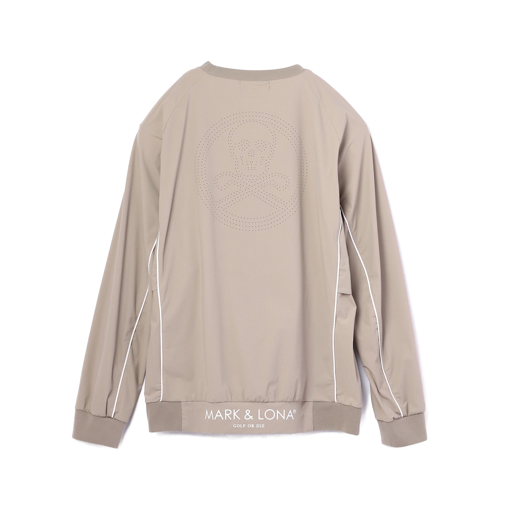 エレガントなデザインのスニードジャック。両脇のポケットにカモフラージュ柄のロゴ入りシリコンシート、左袖に”GOLF OR DIE”のロゴプリント、裾にMARK & LONAのロゴプリント、背面にサークルスカルのレーザーパンチングをあしらいました。インナーでの着用を想定した、ややゆとりのあるシルエットのパターンを採用しています。脇にはベンチレーション機能をもたせ、汗をかきやすい部分にも配慮。軽さと通気性をより向上させた実用性の高いアイテムで、ドライビングレンジやプラクティスシーンでもおすすめの1着です。同素材のパンツ(MLM-2A-AT05)とセットアップで着用いただけます。